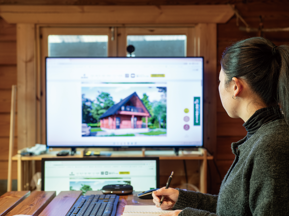 - 就職活動で建築士か施工管理の仕事を探していたところ、会社説明会で「ログハウスを建てている」当社と出会って興味を惹かれました。面接でさらに詳しく話を聞いて、ログハウスを設計することにワクワク感を覚え入社を決めました。1,2年目はログハウス設計の基礎を学び、部分的な作図をして先輩に確認してもらい、修正して、といった作業を繰り返し仕事を覚えていきました。