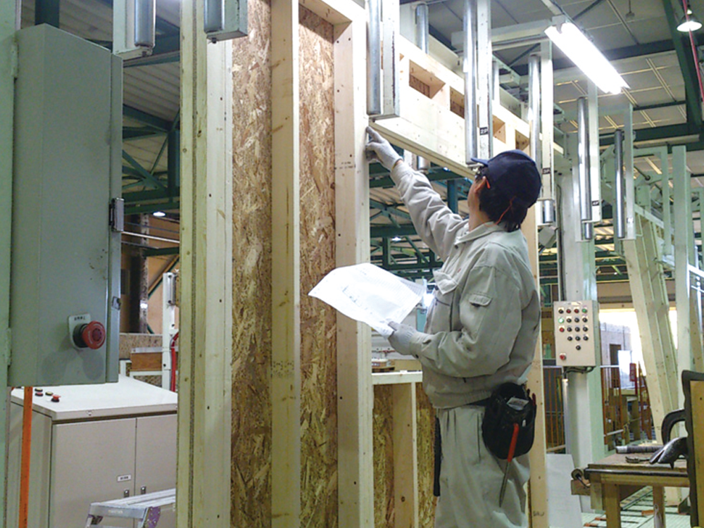 TPS(トヨタ生産方式)を基盤に、自動車生産のノウハウと最新CAD / CAM設備を融合。自由設計に対応した柔軟な生産体制で、高精度な2×4パネルを安定供給し、高品質な住宅づくりを支えています。